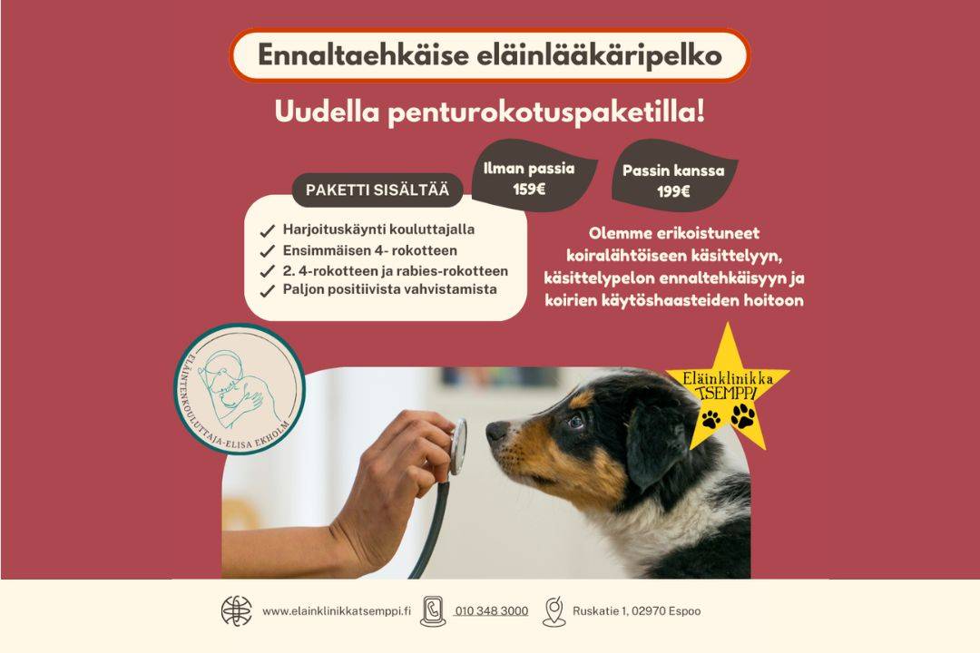 Tsempin pentupaketti sisältää harjoituskäynnin eläintenkouluttajalla, 1. rokotteen 8-12 viikon iässä ja tehosterokotteen sekä rabiesrokotteen 12-16 viikon iässä. Pentupaketti sisältää paljon positiivista vahvistamista sekä mukavia kokemuksia klinikalta.
