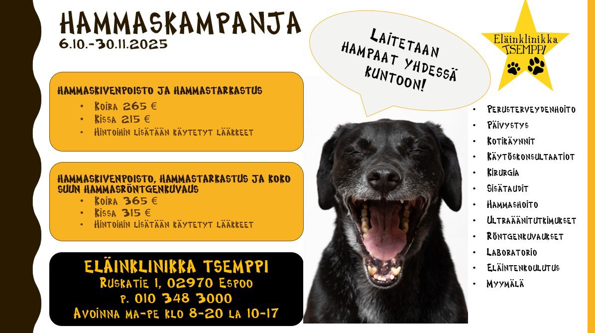 Meille saapuvat asiakkaat löytävät klinikaltamme tiedon ja taidon lisäksi aidosti välittävän henkilökunnan. Henkilökuntamme on panostanut erityisesti lemmikin kokeman stressin vähentämiseen.