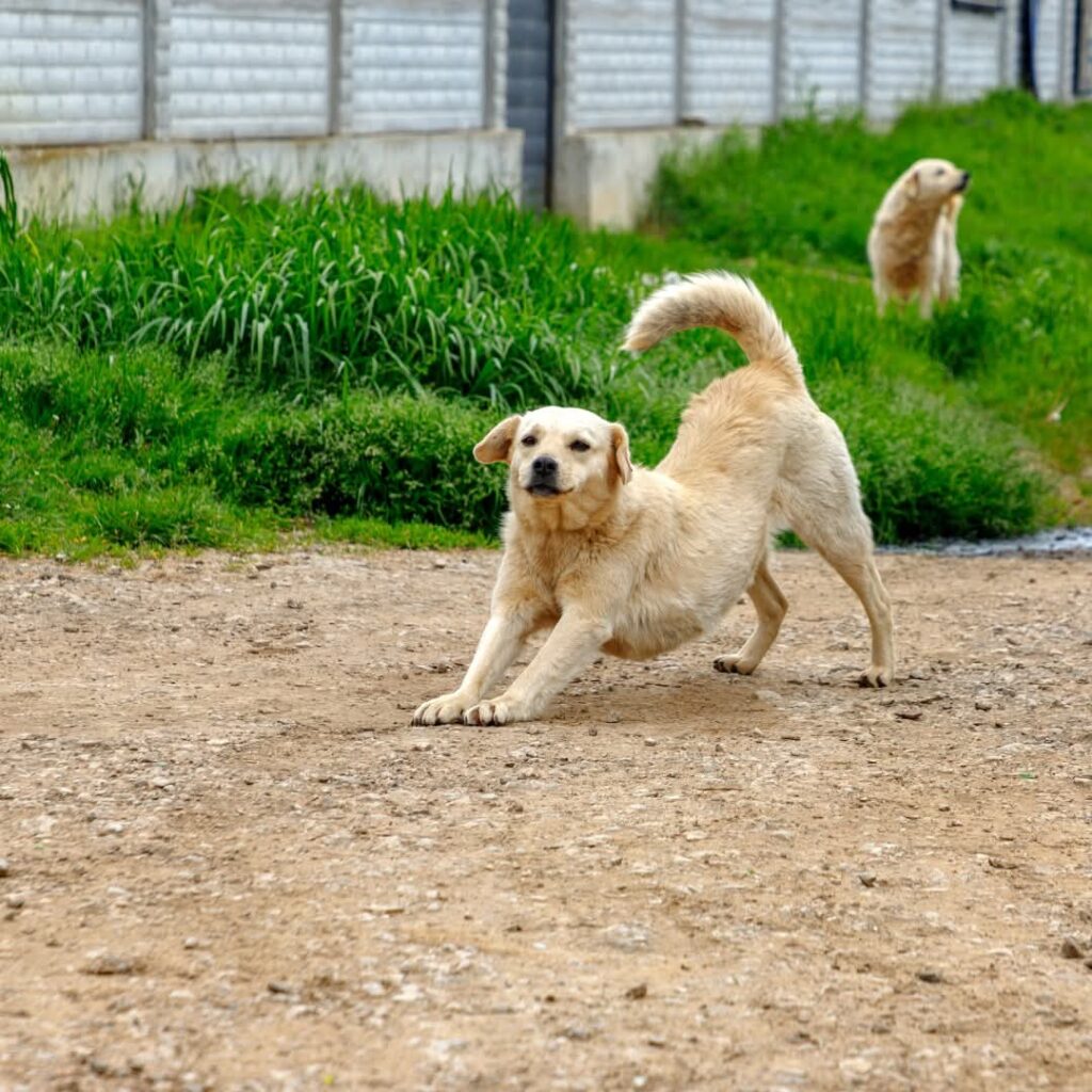 Kohtaamiset toisten koirien kanssa: Koira saattaa venytellä ennen kontaktia tai heti sen jälkeen, viestien rauhaa ja ystävällisyyttä.
